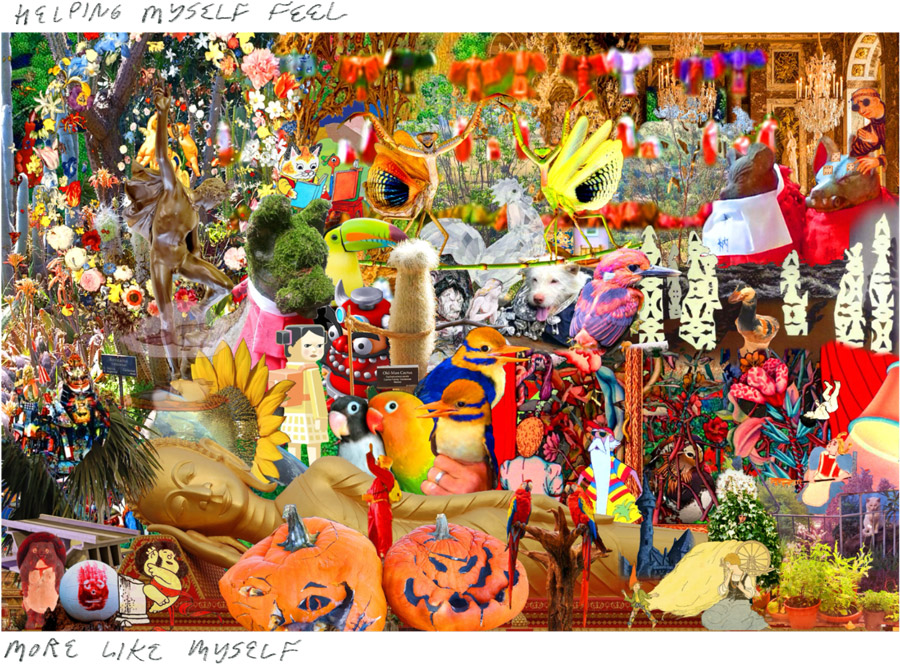 Last fall, Bryan asked if I'd like to produce a project for Great River Review, the University of Minnesota's graduate writing program's magazine, for an issue he was helping produce, and I mean, naturally. I took the opportunity to try for the third(!) time to make the "zine" version of "Helping myself feel more like myself," a digital collage that collects many of "my little guys" that I'd made so I could hang it up and look at it and get charged up. The resulting project for Great River Review, "Romantic elaborations on 'Helping myself feel more like myself'" starts from the finished collage, cuts that back up again into smaller parts, and adds additional text and drawing to each image.