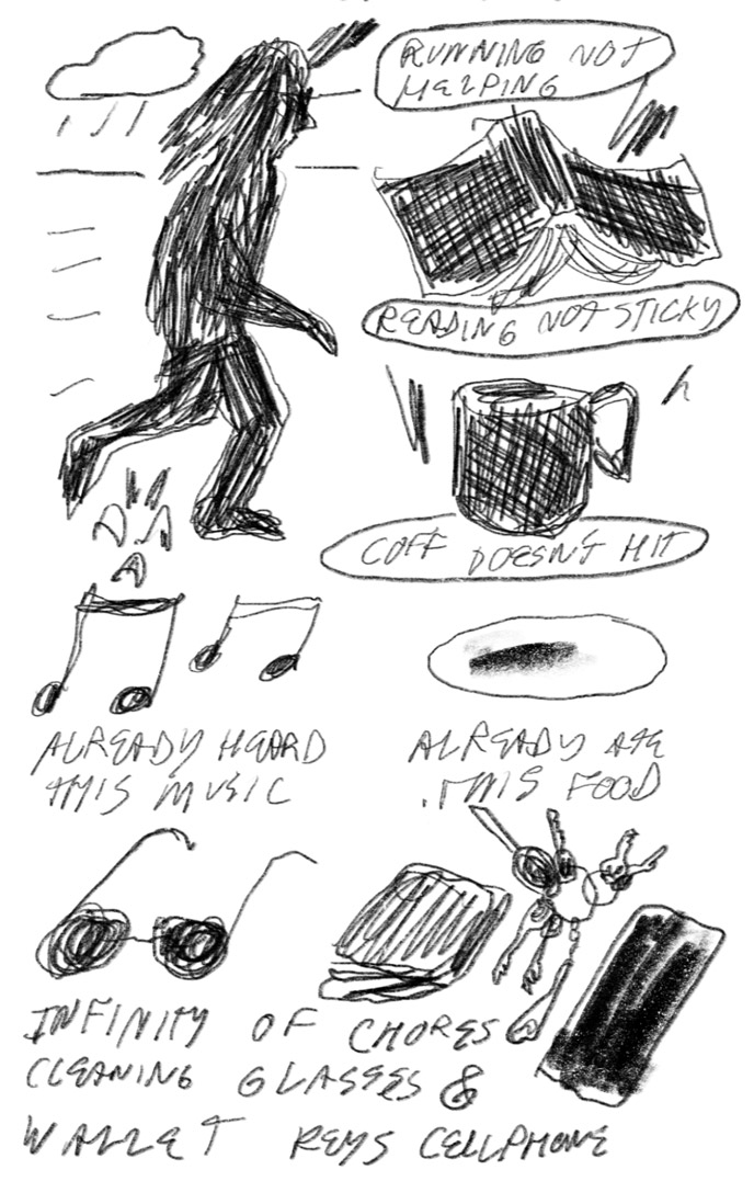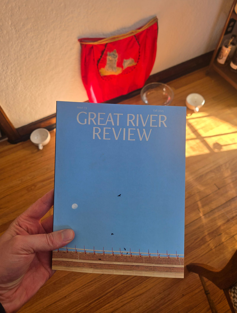 Last fall, Bryan asked if I'd like to produce a project for Great River Review, the University of Minnesota's graduate writing program's magazine, for an issue he was helping produce, and I mean, naturally. I took the opportunity to try for the third(!) time to make the "zine" version of "Helping myself feel more like myself," a digital collage that collects many of "my little guys" that I'd made so I could hang it up and look at it and get charged up. The resulting project for Great River Review, "Romantic elaborations on 'Helping myself feel more like myself'" starts from the finished collage, cuts that back up again into smaller parts, and adds additional text and drawing to each image.